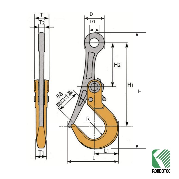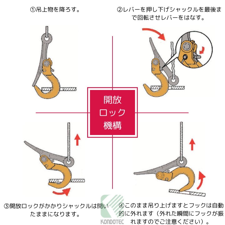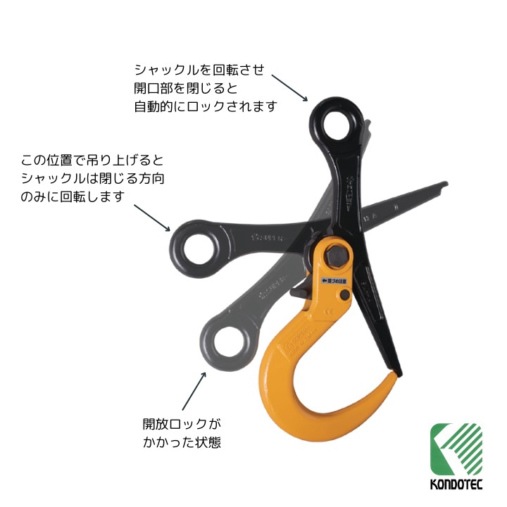 【特長】●吊り上げ時は自動的に閉鎖ロックがかかり、ワークから外れることがなく、安全です。