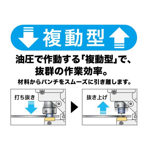 板厚9mm、穴径φ20mmまでの各種鋼材をスピーディに綺麗に打抜き※写真のバッテリは別販売品です。
